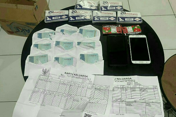“Barang bukti yang diamankan dari pelaku FA yaitu 8 buah stiker, 2 buah handphone, uang sejumlah Rp. 6.450.000,-, 129 buah amplop yang masing-masing berisi uang Rp. 50.000,-, dan 2 buah kartu keluarga,” lanjutnya.